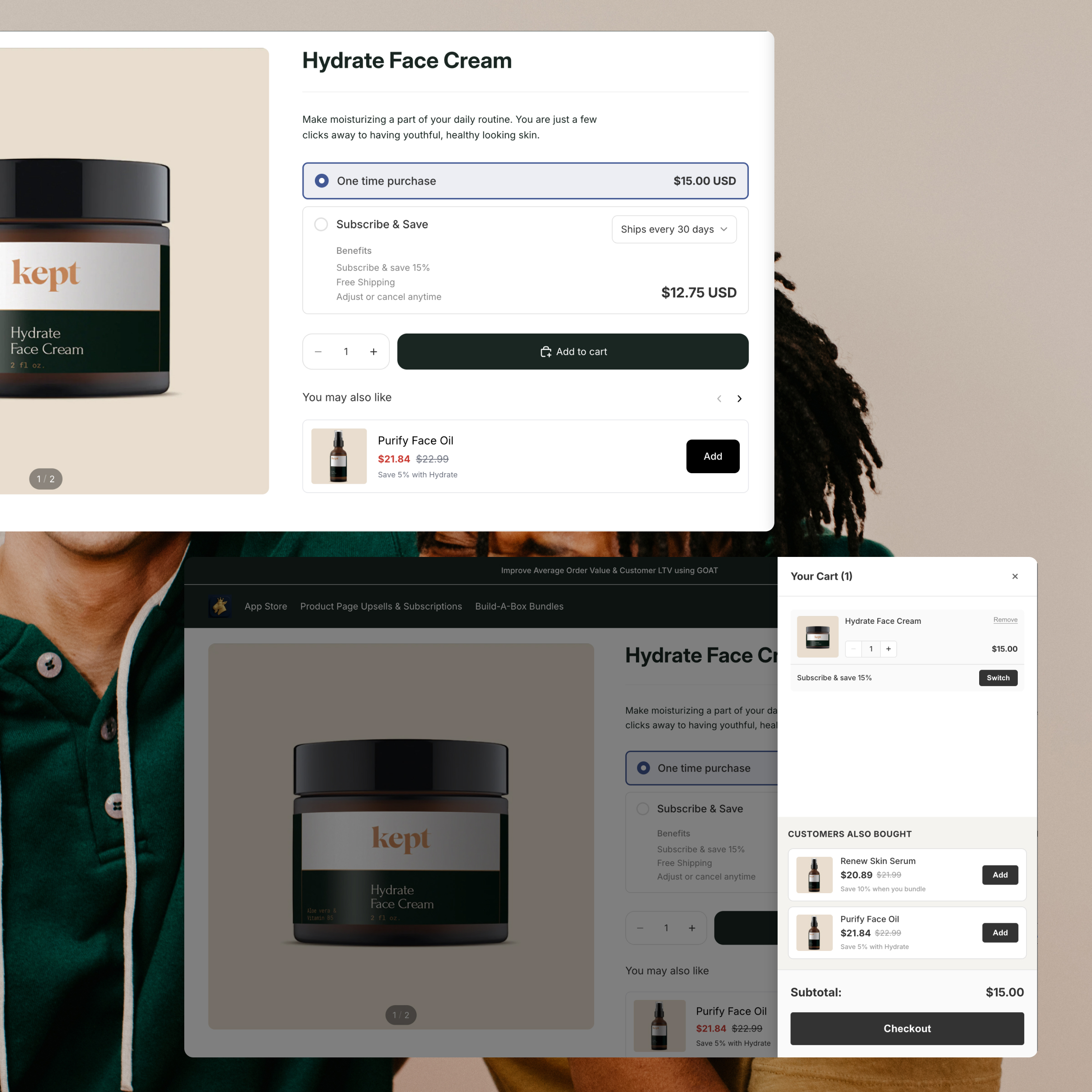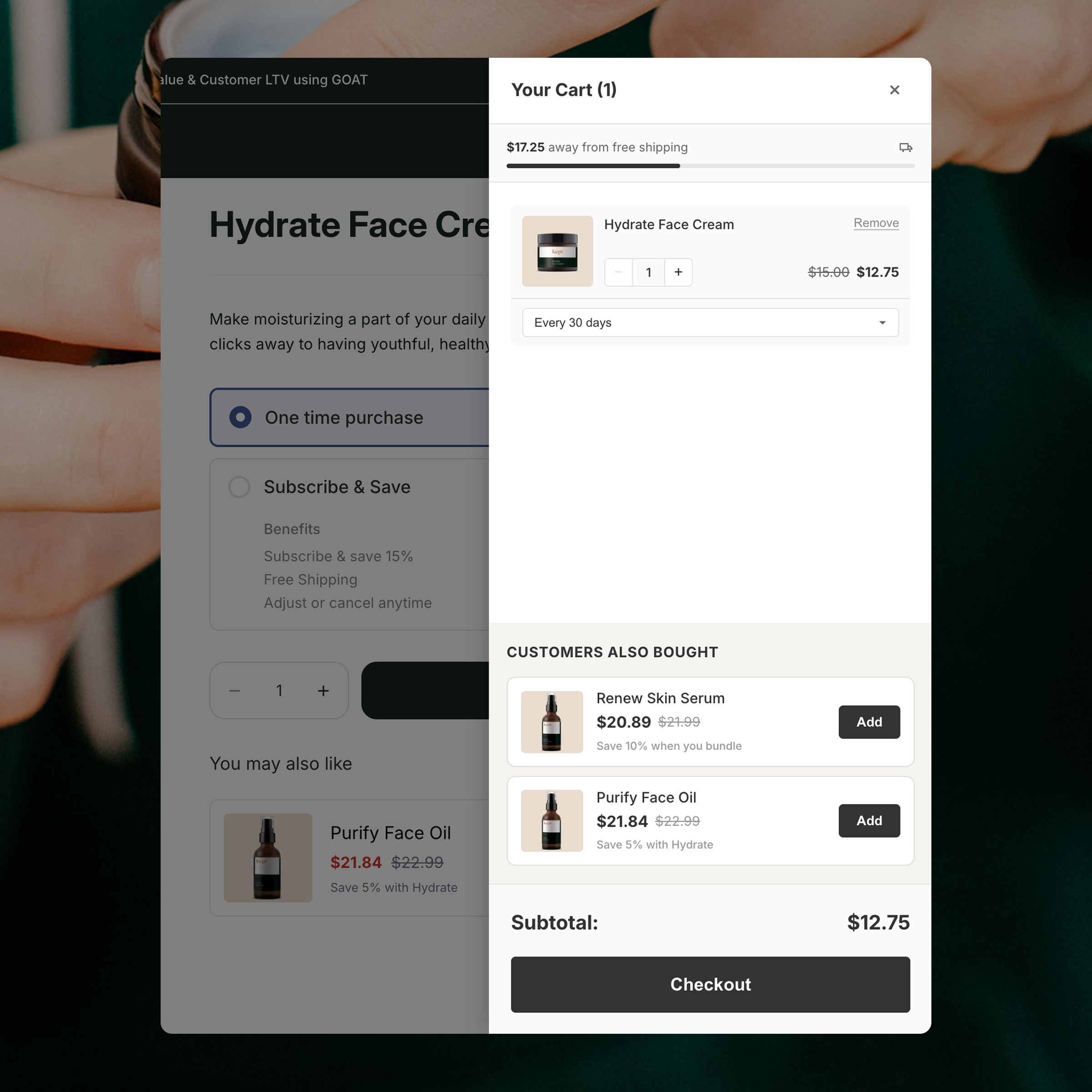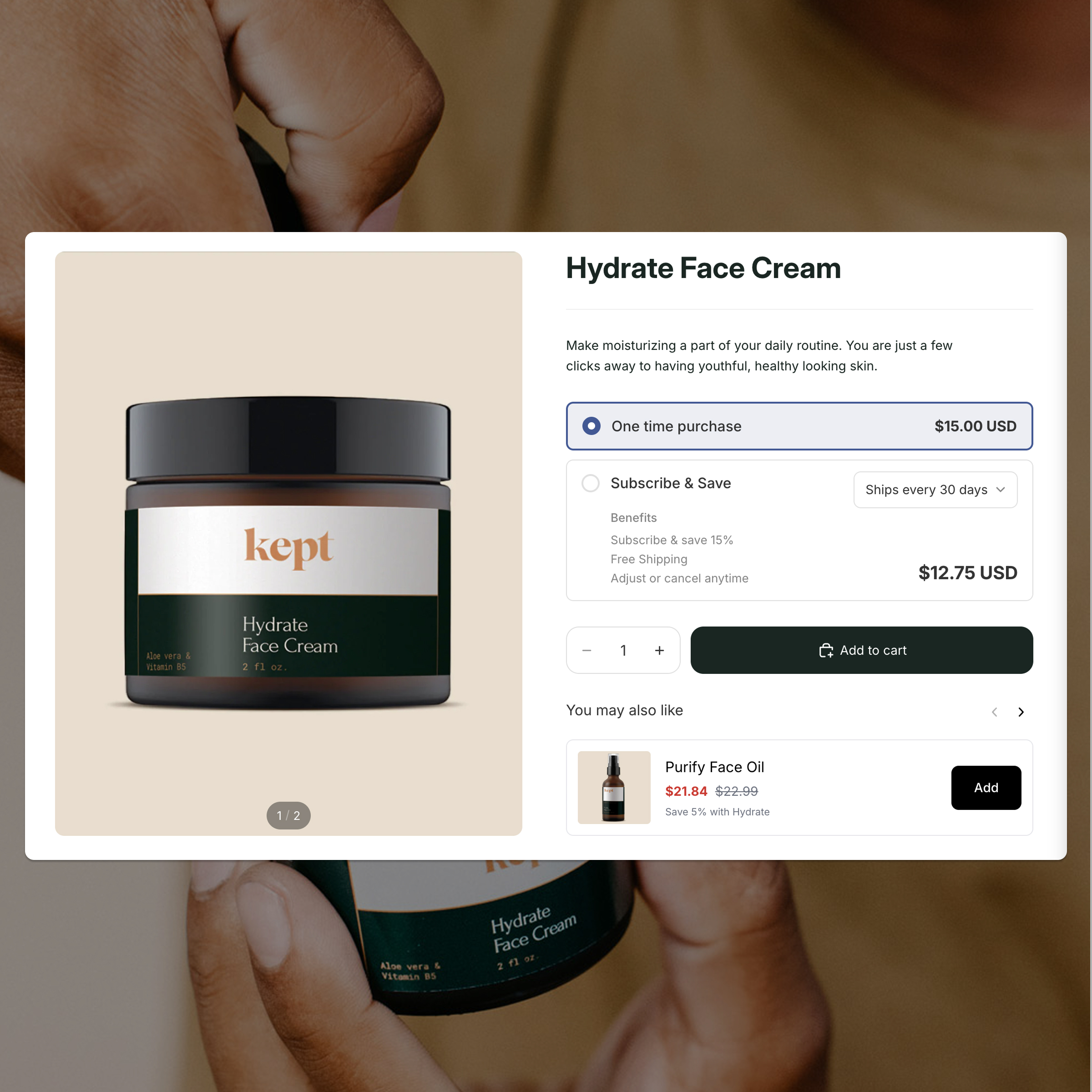 It surfaces the right incentives - free-shipping thresholds, free-gift tiers, complementary products, and subscription upgrades - without disrupting checkout flow. Clear offers, smart recommendations, and a smooth path forward make it easy for customers to add more or upgrade while they’re already in a buying mindset.